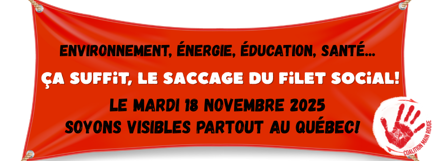 La Coalition main rouge dont est membre le MÉPACQ lance un appel à l’action en vue de la mise à jour économique de l’automne 2025. Nous invitons les syndicats, groupes communautaires ou sociaux de tous les horizons, comités citoyens et la population à déployer des bannières le 18 novembre devant des lieux symboliques des dérapages de la CAQ. Merci de faire circuler à vos membres.